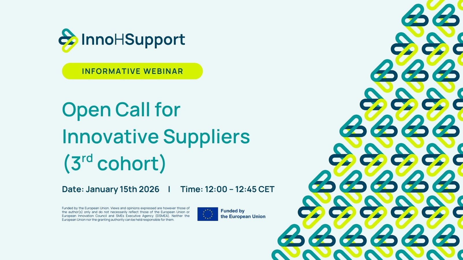 The InnoHSupport open call for Innovative Suppliers starts on February 10th 2025 and consists of 3 cohorts. Each cohort will select 10 innovative suppliers which will take part to individual coaching and collaborative insights’ sessions and to online matchmaking events to showcase their technological innovations and learn about partnering needs.